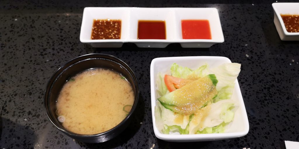 My wife ordered the Lobster Tail with AAA Filet Mignon and I ordered the Salmon Filet, Angus Beef Striploin and Chicken Filet. Since this is teppanyaki, you all get a starter of Miso Soup and Salad. They also serve you three sauces for your liking. Along the way, they were also serving extra pieces to us so we got a shrimp, a scallop and cuttlefish as extras.