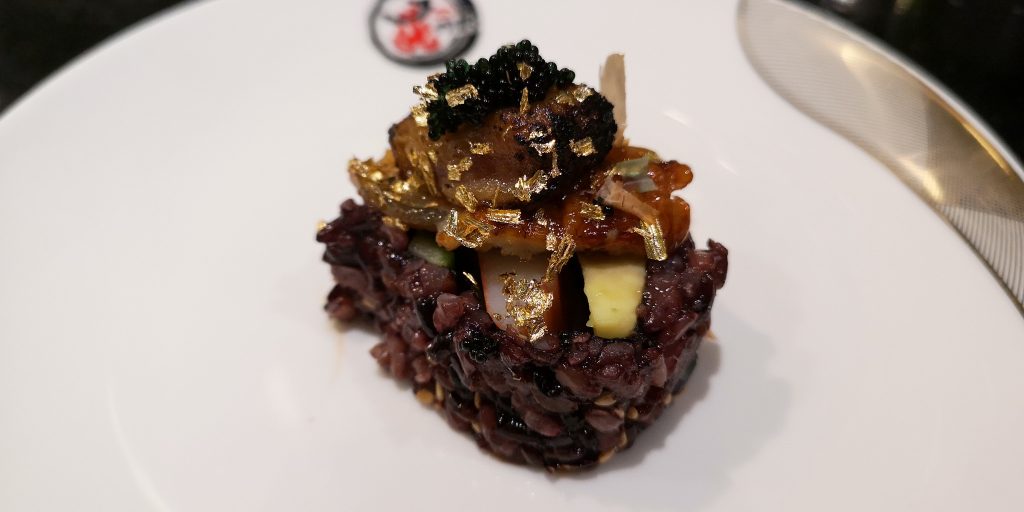 Near the end, we all got beef fried rice along with beansprouts. We were all pretty full. As mentioned, our friend arranged our reservation so the owner of the restaurant gave us a special grapefruit ice cream and one other dish to share. It topped off a great dinner with even a greater surprise as the dish was a spectacular purple rice sushi, topped with fois gras, caviar and edible gold flakes. It was sooooo good! Take a look at our closeup pictures, you’ll want to go just for that sushi dish alone!