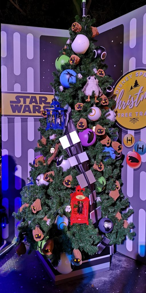 As we walked along we came up to the Disney Springs Christmas Tree Trail where they had fake snow blowing around with a Christmas tree from every theme of Disney.