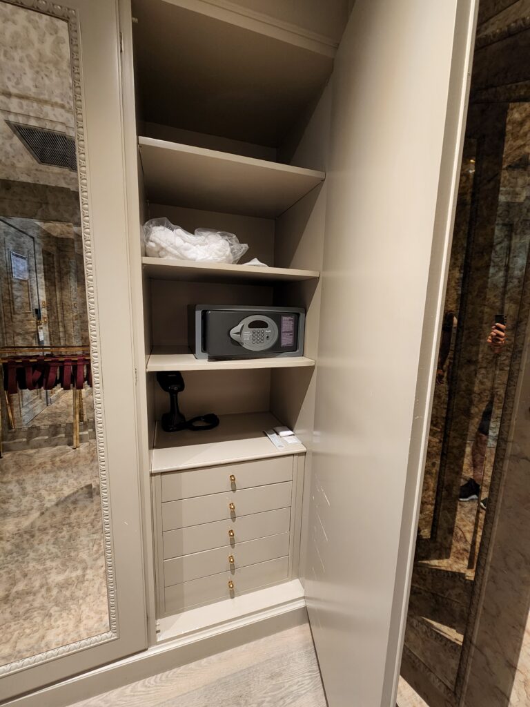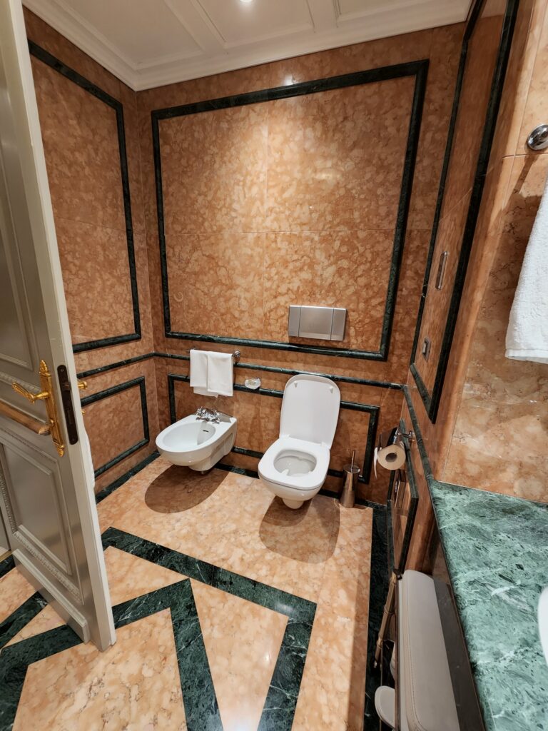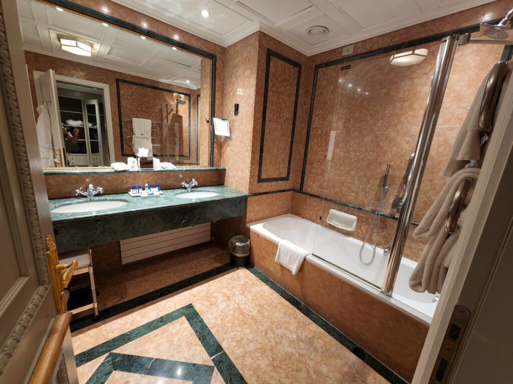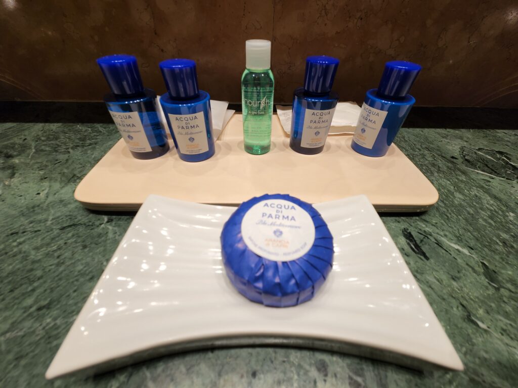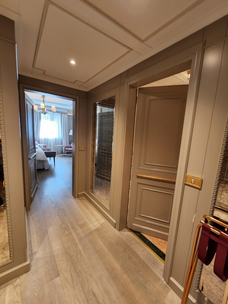 Alrighty then, onto our room. Having come from The St. Regis Venice, this room was definitely an older type of feel, especially the darker themed bathroom. However, we were very delighted to see that they also have Acqua di Parma amenities. Once you enter the room, there is a decent sized hallway with the bathroom on the right and closets on the left. Walking past the bathroom are full sized mirrors before entering the main room.