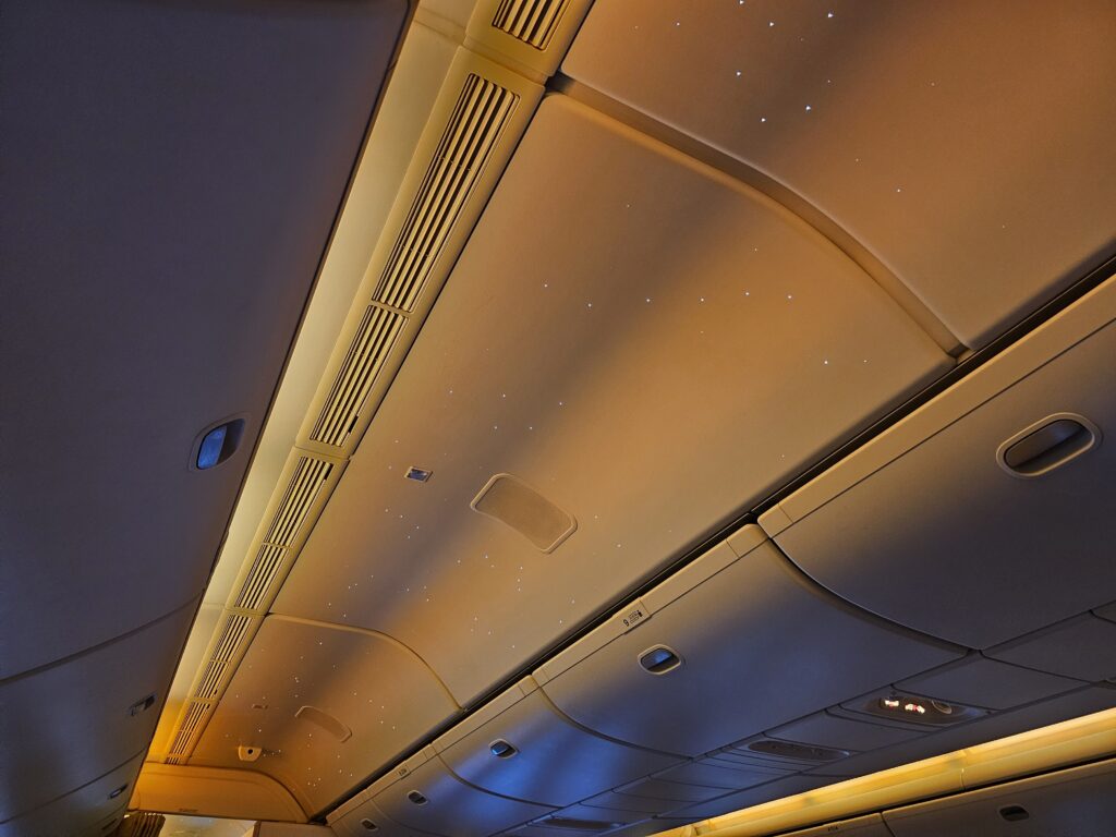 There are overhead bins on both sides as well as the middle. It didn’t make the cabin feel claustrophobic at all. The ceiling also had lighting that made it appear like stars in the night.