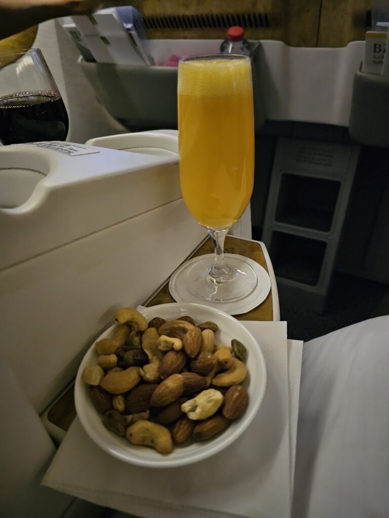 To start, we were served with a mocktail of Orange Fizz and warm nuts. The bowl was larger than other airlines and even had pistachios which was a nice addition. As this was a red-eye flight, they served the entree on one plate which was fine by us as it maximizes the time to get some much needed sleep before arriving in Dubai at 5am on this 7h30m flight.